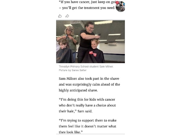 Great job Sam for shaving your hair and making a big difference for kids impacted by cancer.